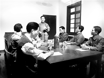 圖5:圖為1927年5月10日,中央監(jiān)察委員會(huì)成員召開(kāi)會(huì)議的模擬場(chǎng)景。站立者為王荷波,其右手起逆時(shí)針依次為:楊匏安、張佐臣、劉峻山、蔡以忱、楊培森、周振聲、許白昊。蕭石月、阮嘯仙沒(méi)有參加會(huì)議。